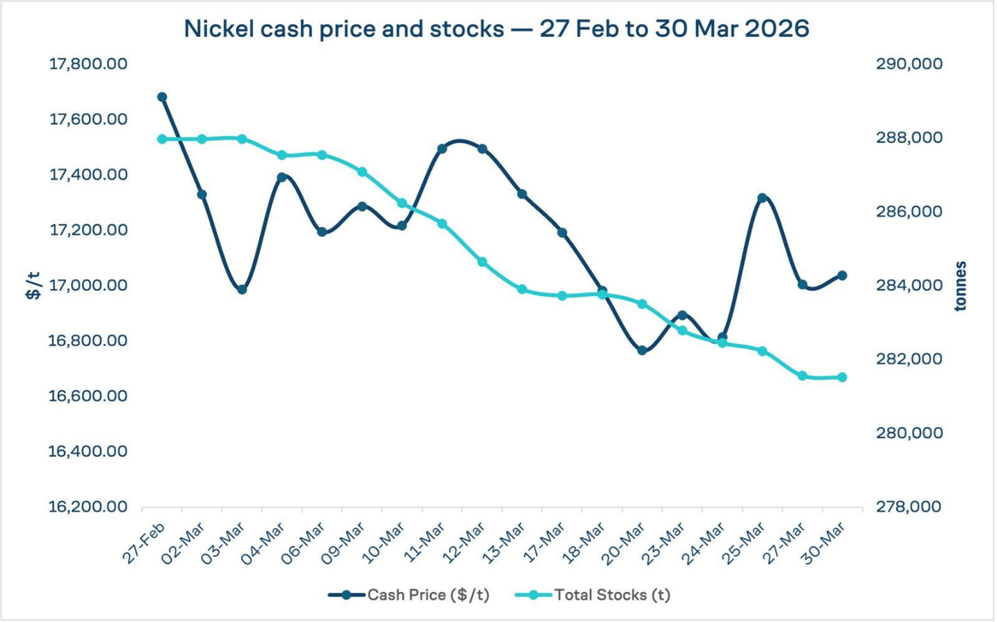 LME cash nickel was trading at $17,000 to $17,020 on Friday, precisely at the lower bound of the $17,000 to $18,000 floor Macquarie has identified. The December 2027 contract is bid at $18,155. Warehouse stocks stand at 282,456 tonnes, with 18,276 tonnes in cancelled warrants, indicating near-term draws already in progress.