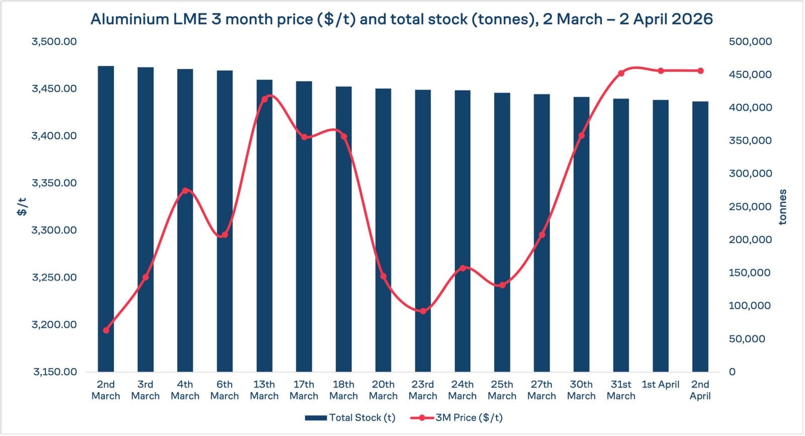 LME aluminium stocks fell 51,650 tonnes between 03 March 2026 and 02 April 2026. But the more telling number is cancelled warrants, which dropped from 375,525 to 269,000 tonnes. Cancelled warrants represent metal queued for physical delivery. That queue has shortened sharply. Less aluminium is being pulled from the system than the headline stock draw suggests. The immediate supply pressure has eased. Whether that reflects demand softening, logistics shifting, or simply a pause before the next wave of cancellations is the question the market is now asking.